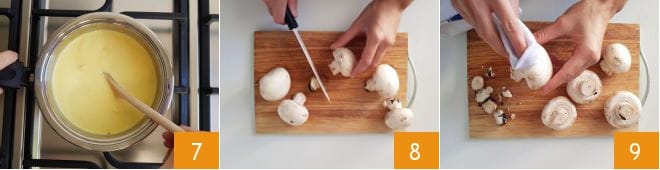 Transfira a panela para o fogo e cozinhe a mistura em fogo baixo por cerca de 15-20 minutos, cuidando para mexer frequentemente. Você deve obter um creme homogêneo 7 não muito espesso, reserve para esfriar. Agora limpe os cogumelos: elimine a parte terrosa do talo 8 e esfregue-os delicadamente com um pano 9.