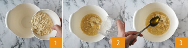 Para preparar as crepes de grão-de-bico com mousse de bacalhau, comece pela preparação da massa. Coloque a farinha de grão-de-bico em uma tigela 1, adicione a água 2, depois uma pitada de sal e uma colher de sopa de azeite extra virgem 3.