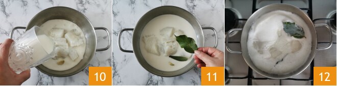 Despeje o leite 10, a sálvia, o louro 11 e cozinhe em fogo médio por 5 minutos 12.