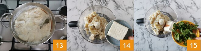 Desligue e deixe esfriar 13. Escorra o bacalhau frio da panela e coloque-o em um processador. Adicione o queijo cremoso 14, uma pitada de sal e uma colher de chá de pimenta e outra de noz-moscada. Aromatize com a salsinha 15 e processe por alguns minutos.