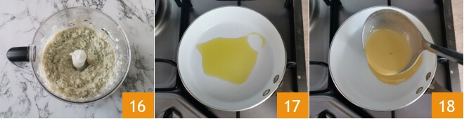 Você deve obter uma espuma macia 16. Agora cozinhe as crepes: em uma panela de cerca de 14 cm de diâmetro, aqueça um fio de azeite extra virgem 17 e depois remova o excesso com um pedaço de papel toalha. Retome a massa das crepes, misture com o batedor e despeje uma concha da massa no centro da panela quente 18. Gire a panela para que a massa cubra toda a superfície uniformemente.