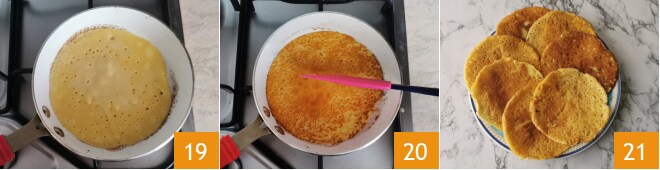 Cozinhe por 1-2 minutos 19 e depois vire a crepe com uma espátula. Cozinhe também o outro lado 20. Conforme você cozinhar as crepes, coloque-as em um prato 21.