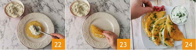 Uma vez frias, recheie as crepes com 1-2 colheres de sopa de mousse de bacalhau 22 e dobre ao meio 23. Tempere com cebolinha picada e sirva suas crepes de grão-de-bico com mousse de bacalhau 24.