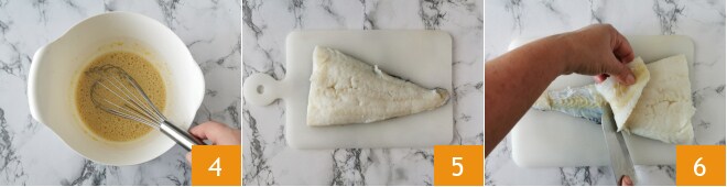 Misture com um batedor de mão e deixe descansar por uma hora 4. Passe para a preparação da mousse de bacalhau. Coloque o filé de bacalhau já demolhado sobre uma tábua 5, faça uma pequena incisão na extremidade da cauda e, com uma faca de cozinha afiada, separe a polpa da pele para remover a última 6. Passe a lâmina rente à tábua segurando com a outra mão a parte da cauda, para que a lâmina deslize melhor.