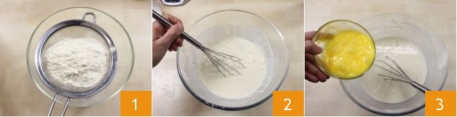 Para fazer as crepes suzette, comece pela massa básica: coloque em uma tigela alta a farinha peneirada 1, o açúcar refinado, as sementes de meia fava de baunilha, uma pitada de sal e o leite. Misture a massa com um batedor de mão ou com uma batedeira elétrica até que fique homogênea 2. Em uma tigela separada, bata os ovos com um garfo, depois adicione-os aos outros ingredientes 3 e continue misturando.