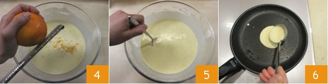Derreta a manteiga em uma panela em fogo baixo e deixe esfriar, depois adicione-a à massa para as crepes e misture bem. Por fim, adicione à massa a casca ralada de meia laranja 4. Misture bem os ingredientes para obter uma massa densa sem grumos 5. Cubra a massa com filme plástico e deixe descansar por pelo menos meia hora na geladeira. Após o tempo de descanso, pegue a massa das crepes, prepare uma frigideira para crepe, plana e com bordas baixas, aqueça a frigideira, despeje uma concha de massa 6 e cozinhe a primeira crepe girando a frigideira para distribuir a mistura por toda a superfície.
