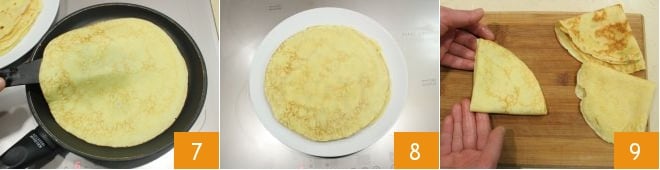 Cozinhe as crepes dos dois lados, virando-as com uma espátula 7. À medida que cozinhar as crepes, transfira-as para um prato, uma em cima da outra, para não secarem 8. Dobre as crepes em 4 para formar pequenos leques 9.