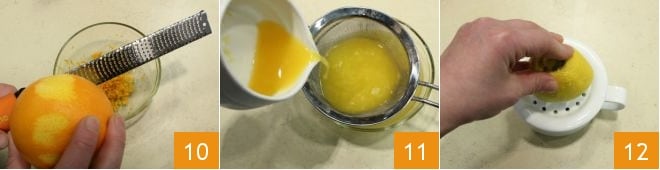 Agora prepare o molho, rale a casca de 3 laranjas 10, esprema o suco e coe 11 e também rale a casca do limão, esprema o suco do limão 12