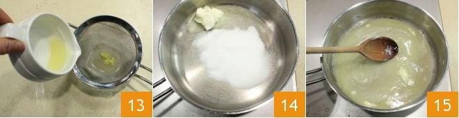 esprema o suco e coe através de uma peneira 13. Coloque a manteiga em uma panela junto com o açúcar 14 e derreta-os em fogo baixo, mexendo com uma colher de pau 15, use uma panela de aço inoxidável, ideal para flambar.