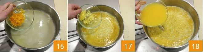 Aromatize com a casca das laranjas 16, do limão 17 e despeje o suco de laranja 18