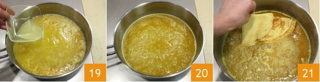 e o de limão 19. Cozinhe o molho em fogo baixo até que o açúcar se derreta 20 e, em seguida, mergulhe as crepes no molho de laranja para dar sabor a elas 21.