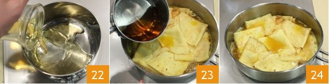 À parte, em uma panelinha, aqueça o Grand Marnier 22 e depois despeje-o na panela com as crepes 23, agora acenda o licor para o flambé; para apagar a chama basta cobrir a panela com uma tampa. As crepes suzette estão prontas para serem saboreadas 24, os mais gulosos podem acompanhá-las com uma ganache de chocolate feita derretendo o chocolate amargo no creme de leite.