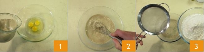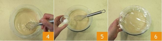 e misture com um batedor 4. Adicione uma pitada de sal 5 e mexa novamente energicamente, para obter uma massa lisa e homogênea. Cubra com filme plástico 6 e deixe descansar na geladeira por 30 minutos.