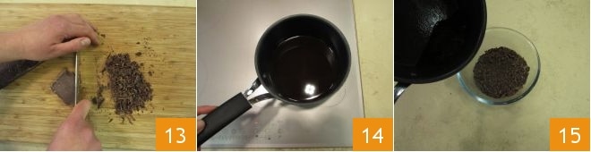 Agora passe para o molho: pique a outra porção de chocolate amargo 13 e aqueça o restante do café até quase ferver 14. Em seguida, despeje o café sobre o chocolate 15