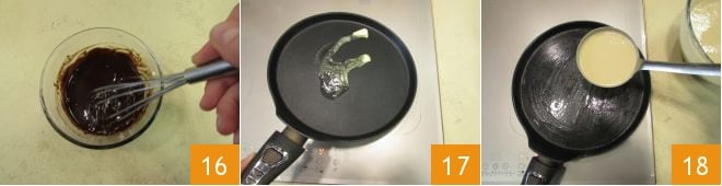 e mexa até derreter 16. Reserve e não se preocupe se o creme tender a solidificar, basta aquecê-lo antes de despejá-lo sobre as crepes. Agora só falta cozinhar suas panquecas: aqueça uma crepeira ou uma frigideira antiaderente, unte com um pedaço de manteiga 17 e despeje uma concha da massa 18.