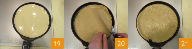 Gire a panela para distribuir a massa uniformemente e cozinhe por cerca de um minuto 19. Quando as bolhas clássicas se formarem na superfície e as bordas se soltarem, vire-as 20 e cozinhe o outro lado por cerca de meio minuto 21. Continue assim até cozinhar todas as crepes.