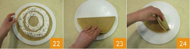 Passe para o recheio: retome o creme de ricota e esprema uma parte dentro da crepe, fazendo dois círculos 22, depois dobre-a primeiro ao meio 23 e depois novamente ao meio 24
