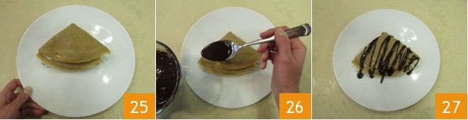 para formar um triângulo 25. Recheie assim todas as outras, aqueça o molho de chocolate e use-o para decorar suas crepes de café antes de servir (26-27).