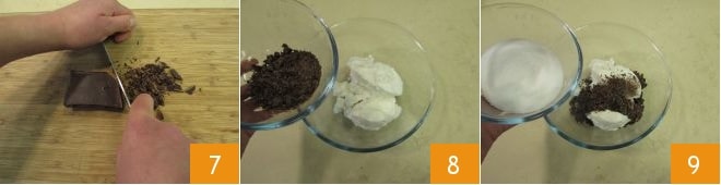 Enquanto isso, cuide do recheio: pique grosseiramente 50 g de chocolate amargo 7 e adicione-o à ricota 8. Depois acrescente o açúcar granulado 9,