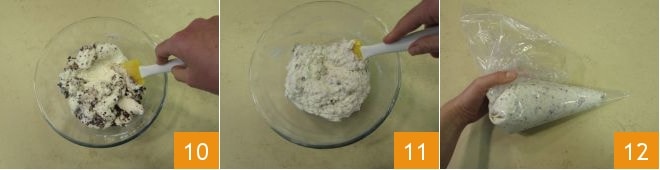 misture com uma espátula 10 e, uma vez obtida uma mistura homogênea 11, transfira para um saco de confeitar 12 e coloque na geladeira.