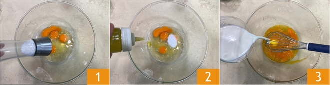 Para preparar as crepes de espinafre com salmão, primeiro quebre os ovos em uma tigela, depois adicione o sal 1, o óleo 2 e o leite 3. Misture bem com um batedor manual.