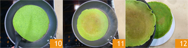 Cozinhe em fogo médio-baixo até que as bordas comecem a se soltar 10, depois vire a crepe e cozinhe também do outro lado por um total de cerca de 3 minutos 11. Retire a crepe da frigideira e empilhe-as em um prato 12; com essas quantidades, você obterá cerca de 10 crepes de espinafre.