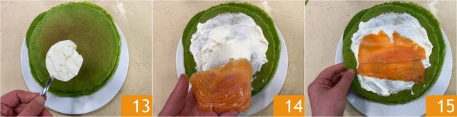 Depois de cozinhar todas as crepes, prossiga com o recheio: espalhe o queijo fresco por toda a superfície 13, depois coloque algumas fatias de salmão defumado 14. Dobre primeiro os lados para dentro 15.