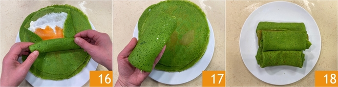 Uma vez dobrados os lados, enrole a crepe 16 de modo a selar o recheio 17. Prossiga desta forma para rechear todas as outras. Suas crepes de espinafre com salmão estão prontas para serem saboreadas 18!