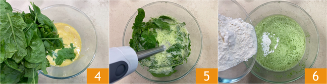 Adicione os espinafres frescos, lavados e bem escorridos 4, e bata com um mixer de imersão 5 até obter uma mistura lisa e homogênea. Neste ponto, incorpore a farinha 6.