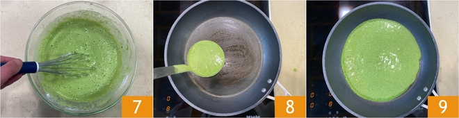 Misture novamente com o batedor para absorver completamente 7. Agora aqueça bem uma frigideira antiaderente de 22 cm de diâmetro e unte-a com óleo, depois despeje uma concha de massa no centro 8 e mova a frigideira para distribuí-la uniformemente 9.