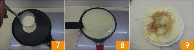 Aqueça e unte levemente uma frigideira para crepe de cerca de 24 cm de diâmetro, ou uma frigideira antiaderente de fundo grosso: unte com pouquíssima manteiga e passe papel-toalha por toda a superfície (essa operação deve ser repetida pelo menos mais uma vez, depois de cozinhar os primeiros dois crepes). Despeje uma concha de massa de cada vez 7 e distribua por toda a superfície usando o utensílio apropriado, ou basta girar a frigideira para mover a massa, de forma a obter um disco que cobre toda a superfície. Assim que as bordas começarem a se soltar, use uma espátula para desgrudar 8 e vire delicadamente o crepe do outro lado, para cozinhar uniformemente. Isso levará cerca de 1 minuto e meio de um lado e 30 segundos do outro, totalizando um par de minutos. Continue assim até cozinhar todos os crepes e vá colocando-os em um prato 9, cobrindo-os com filme plástico assim que esfriarem para não ressecarem. Devem render 6 crepes de aproximadamente 24 cm.