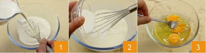 Para preparar as crepes torta de maçã, comece pela massa das crepes. Despeje em uma tigela a farinha peneirada, adicione o leite 1 e misture. Em seguida, adicione o açúcar 2 e uma pitada de sal. Trabalhe a mistura com um batedor de mão até que fique lisa e sem grumos. Em uma tigela à parte, bata os ovos 3