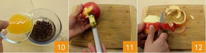 então adicione o suco de laranja 10. Passe a preparar as maçãs: retire o miolo com o utensílio apropriado 11, depois retire a casca 12