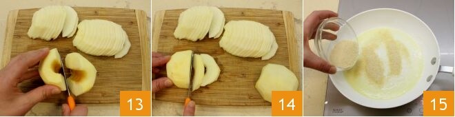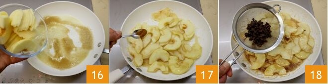 e misture por alguns instantes com uma espátula. Em seguida, adicione as fatias de maçã 16, misture e deixe caramelizar, polvilhe com canela 17. Cozinhe por alguns instantes, então escorra as passas reservando o líquido de molho e adicione-as às maçãs 18. Adicione também 30 ml do líquido em que as passas foram deixadas de molho e cozinhe em fogo médio