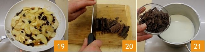 até criar um creminho: as maçãs devem estar macias, mas não se desmancharem 19. Em seguida, dedique-se à ganache de chocolate amargo: pique o chocolate grosseiramente 20, e adicione-o ao creme de leite já aquecido em uma panela 21.