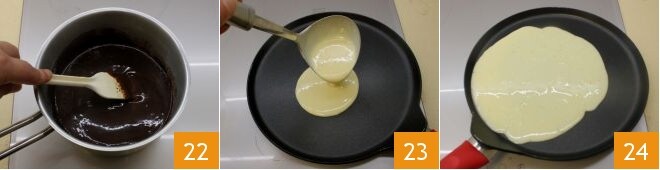 Ligue o fogo baixo e misture até que o chocolate esteja derretido 22; para mais informações sobre o procedimento, você pode consultar a receita da creme ganache. Deixe o molho de lado, enquanto começa a preparar as crepes: retire a massa da geladeira e misture. Aqueça uma frigideira para crepes ou uma frigideira antiaderente de 30 cm de diâmetro (você pode untá-la levemente com manteiga ou com pouco óleo). Despeje uma concha de massa 23 e espalhe por toda a superfície girando a frigideira 24