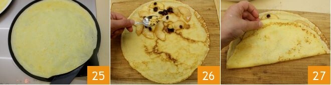 Cozinhe a crepe por cerca de um minuto, depois desgrude-a delicadamente com a espátula apropriada 25 ou uma espátula de madeira para virá-la do outro lado e cozinhar por mais um minuto. Prossiga da mesma maneira até terminar a massa. Uma vez prontas, as crepes podem ser recheadas: coloque o recheio em metade de cada crepe, adicione também uma colher de chá de pinhões 26 e feche-a em meia-lua 27.