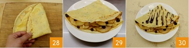 Dobre cada crepe em triângulo 28 e, uma vez pronta 29, decore-a com a ganache de chocolate antes de servir 30. Suas crepes torta de maçã estão prontas para serem saboreadas!