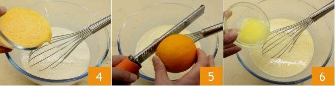 e adicione-os à massa 4. Também adicione as raspas de uma laranja ralando-as diretamente na tigela 5 e continue misturando, então adicione também a manteiga derretida 6,