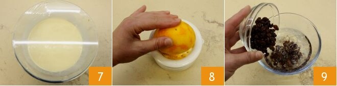depois cubra a massa com filme plástico 7 e deixe descansar por pelo menos meia hora na geladeira. Enquanto isso, esprema o suco da laranja 8 e coe. Depois, lave as passas e coloque-as de molho em água morna para reidratá-las 9,