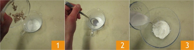Prepare o fermento: dissolva o fermento no leite morno (recomendamos não ultrapassar 30º) 1 e misture 2, em seguida, despeje imediatamente a mistura em uma tigela com 100 g de farinha 3.