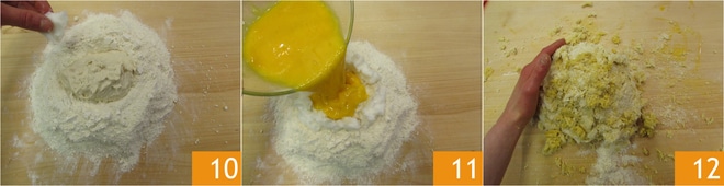 No centro, coloque o fermento e distribua a banha ao redor em pedacinhos 10. No centro, despeje também os ovos 11, comece a misturar com um garfo ou com as mãos para não deixar escorrer a mistura 12.