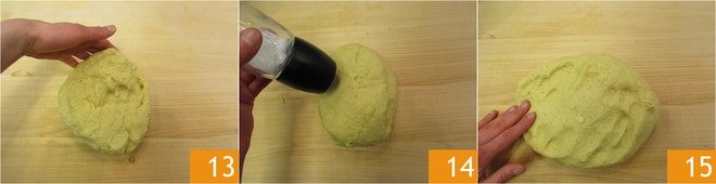 Continue a trabalhar a massa por cerca de dez minutos 13, no início pode ser muito pegajosa, mas conforme você continua a amassar, os ingredientes se misturarão. No final, adicione o sal 14 e trabalhe mais um pouco para incorporá-lo 15.
