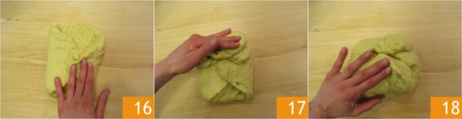 Dê dobras na massa: achate-a formando um quadrado, depois com as mãos, leve as extremidades para o centro, uma de cada vez, formando uma espécie de “pacote” 16. Faça o mesmo com as outras duas extremidades 17 18.