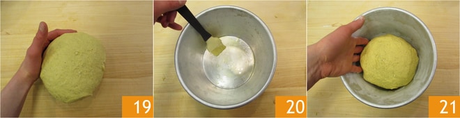 Vire de modo que a costura esteja em contato com a superfície de trabalho, então puxe a massa girando sobre a superfície para selar a costura 19. Pegue a forma de alumínio com diâmetro inferior de 16 cm, diâmetro superior de 19,5 cm e altura de 12 cm. Unte bem com óleo e enfarinhe cuidadosamente. Coloque a massa dentro, cubra com plástico e deixe crescer por cerca de 2 horas longe de correntes de ar ou no forno com a luz apagada (a temperatura deve estar em torno de 26º).