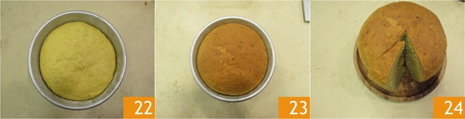 A massa deve chegar quase à borda da forma 22, então, se 2 horas não forem suficientes, deixe crescer por mais tempo. Asse a crescia em forno estático pré-aquecido a 160º por 40 minutos, colocando a forma na prateleira inferior do forno. Após 40 minutos, aumente a temperatura do forno para 170º e asse por mais 10 minutos: deixe a forma na prateleira inferior se a crescia já estiver dourada, caso contrário, você pode movê-la para uma prateleira mais alta, o importante é que a cúpula não toque na resistência. Antes de retirar do forno, faça o teste do palito para verificar o cozimento 23. Retire a crescia do forno e deixe esfriar um pouco, então retire da forma e deixe esfriar em um prato de servir 24. Espere que a crescia esteja bem fria antes de cortá-la e servi-la 24!
