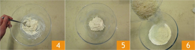 Misture rapidamente com uma colher 4 ou com as mãos, até absorver toda a farinha. Uma vez pronto 5, cubra com filme plástico e deixe o fermento crescer por cerca de 2 horas em um local morno, deverá dobrar de volume. Meia hora antes de terminar a fermentação, comece a pesar a banha e deixe-a em temperatura ambiente para amolecer. Quando o fermento estiver pronto, despeje 400 g de farinha em uma tigela e adicione os queijos ralados: Parmigiano Reggiano DOP e Pecorino romano 6.