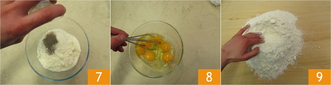 Tempere com 2 colheres de chá de pimenta moída 7 e misture. Quebre os ovos em uma tigela e bata levemente 8. Na superfície de trabalho, despeje a mistura de farinha, queijos e pimenta e faça uma cavidade 9.
