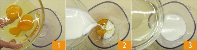 Para preparar as crepes primavera, primeiro cozinhe os espinafres em água fervente e escorra bem para eliminar o excesso de líquido. Passe para a massa das crepes: coloque os ovos em um recipiente alto e estreito 1, depois adicione o leite 2 e o óleo vegetal 3.