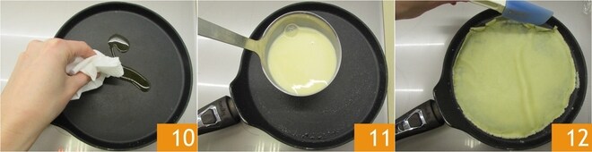 Esquente em fogo médio-baixo uma frigideira antiaderente com cerca de 18 cm de diâmetro e unte levemente 10, depois despeje no centro uma concha da massa clássica 11 e gire a frigideira para espalhar de forma uniforme. Quando as bordas começarem a se soltar, vire a crepe com uma espátula 12 e cozinhe por um minuto também do outro lado.